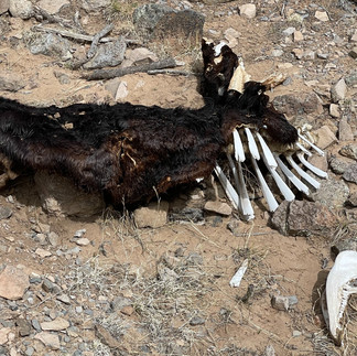 We took a hike up the mountain behind the compound along a rough trail that had horseshoe, deer and elk prints but no human footprints that we could discern. Besides the wonderful views the trail offered a sun-dried cow carcass, a large bird nest in the cliffs (could it be a condor?), and small forest of junipers high up in a dry riverbed.